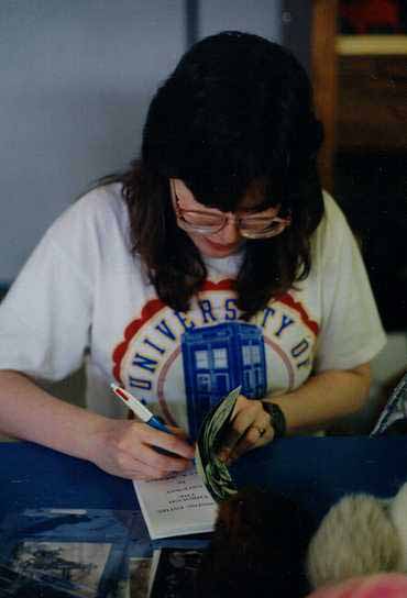 Our first Guest of Honor, fan author, Laura Johnson, autographs copies of her