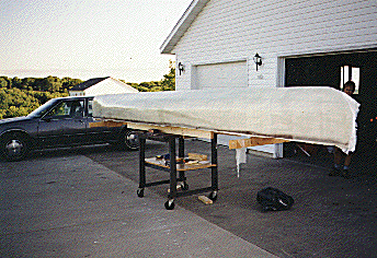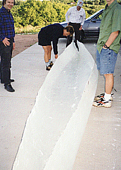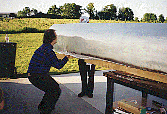 This picture shows the hull after being removed from the mold. It is one flexible piece at this point of construction and needs to be handled with care.